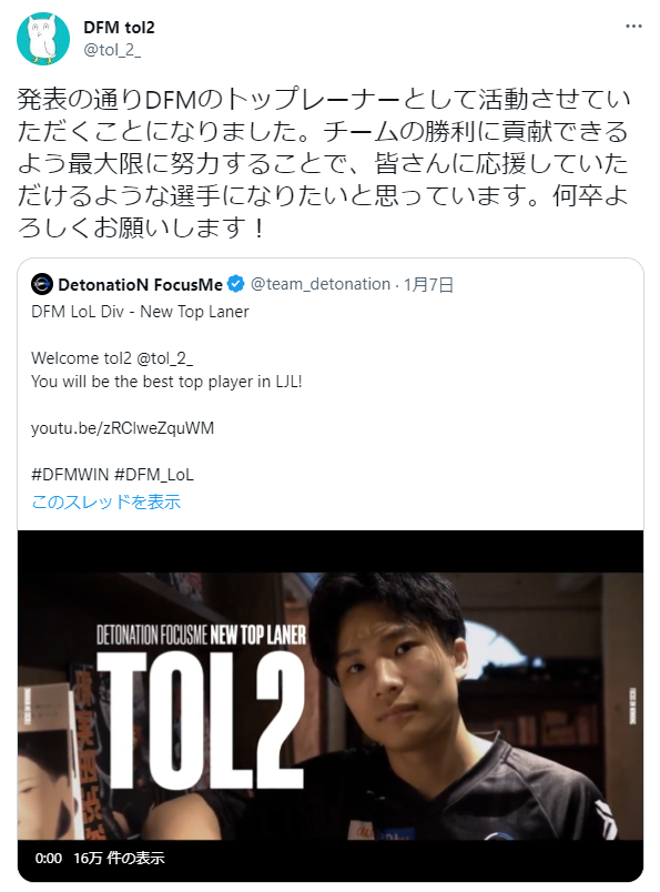 【LJL】DFM、Eviの後釜にtol2を起用へ アカデミーから昇格